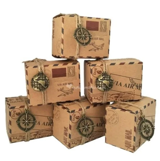 - Scatolina tema viaggio in carta kraft comprensiva di ciodolo (mappamondo/bussola in metallo color bronzo circa 2 cm) e cordino di spago per confezionamento.